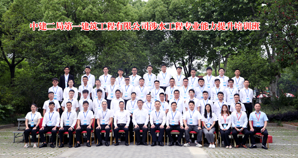 开班仪式结束后院领导和学员合影留念。来自中建二局一公司基础事业部和华南分公司的60多名学员参加此次培训。培训学员将通过课堂授课、分组研讨、现场实地参观等形式进行为期一个月的涉水工程专业基础知识、水利水电工程技术、水利水电工程项目管理等内容的学习。
