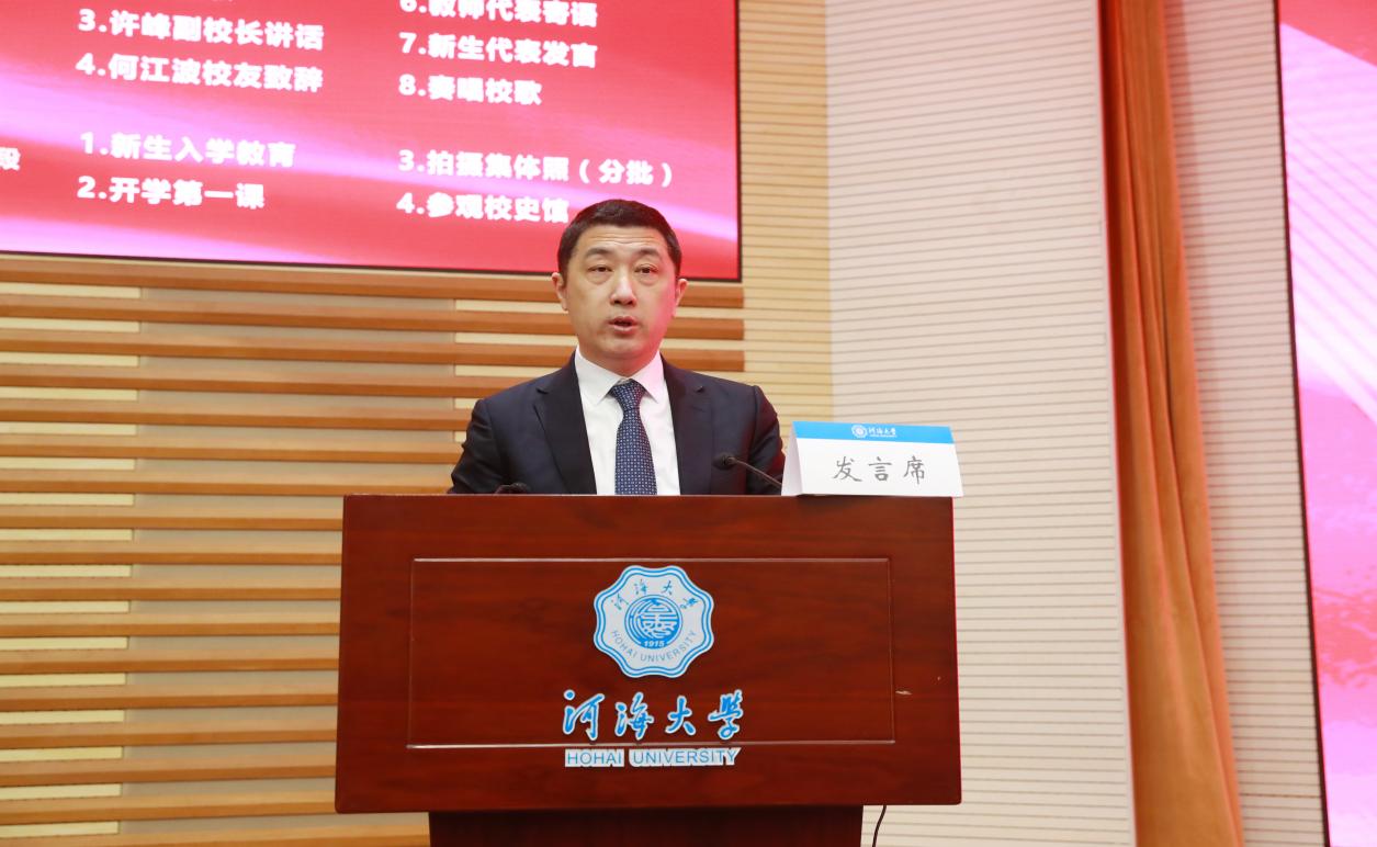 许峰副校长以百年河海的辉煌历史,激励新同学们要勇担新时代河海人的使命与责任,共同谱写“大哉河海奔前程”的新华章。他对广大新生提出三点希望和要求:一是要心怀家国,志存高远。二是要锐意创新,登高望远。唯有创新方能赢得未来,同学们要以创新的精神去发现问题,以创新的思维去研究问题,以创新的举措去解决问题三是要躬身实践,做到行稳致远。希望同学们在实践中学真知、悟真谛,将实干进行到底,赢得美好未来,收获精彩人生,努力成长为可堪大任、引领未来的社会栋梁与行业精英。