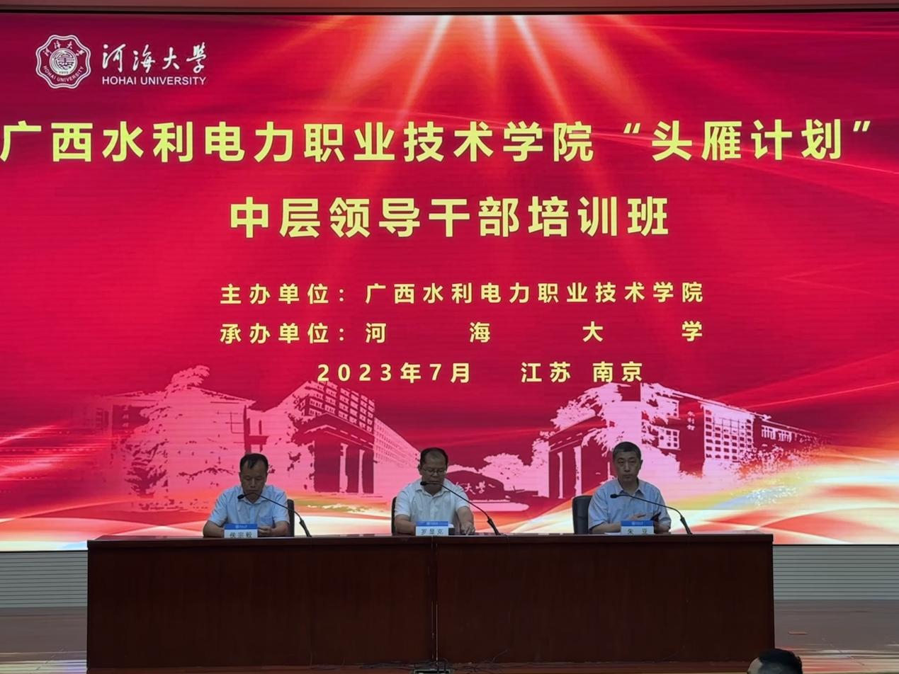 7月9日,广西水利电力职业技术学院“头雁计划”中层领导干部培训班在永利集团304am登录顺利开班。广西水利电力职业技术学院党委书记罗显克、永利集团304am登录远程与继续教育学院院长朱亚出席开班仪式,广西水利电力职业技术学院党委副书记侯宗毅主持开班仪式。