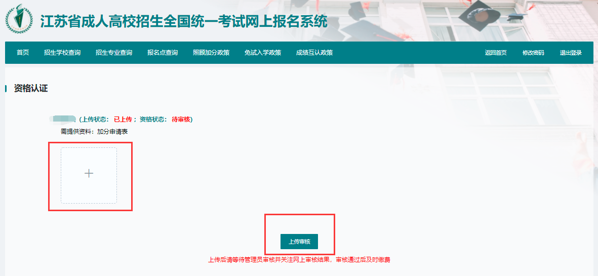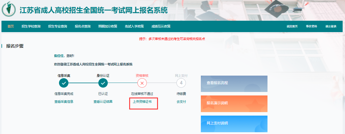 特殊类考生(医学类、免试生、照顾加分、专升本学历认证未通过、没有身份证的考生)在线认证未通过的考生需要持相关审核材料进行现场认证。普通考生及资格审核通过的考生可直接进行支付。上传材料后请等待管理员审核意见,再进行下一步操作,认证通过的考生可进入下一步进行支付,认证不通过的考生耐心等待管理员审核意见;如多次审核不通过可联系报名点。