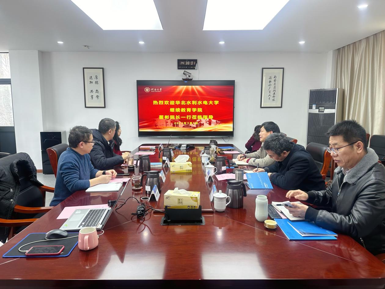 3月6日下午,华北水利水电大学继续教育学院院长、培训中心主任苗彬,副院长、培训中心副主任吴礼明、张霞一行4人前来永利官网调研交流。学院党总支书记、院长朱亚,副院长姚文贤出席调研座谈会。