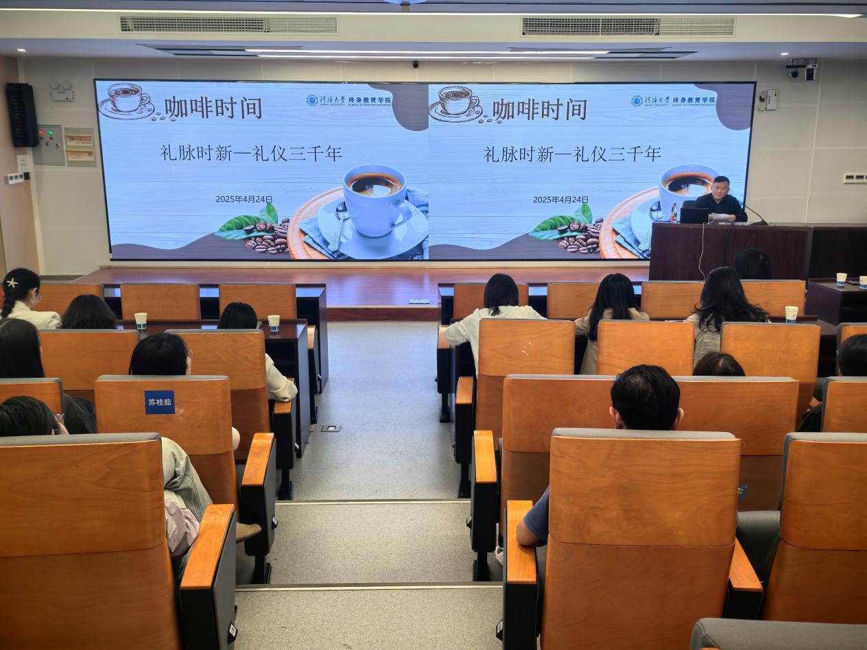 4月24日下午,永利集团304am登录举办本年度第二期“咖啡时间”文化沙龙活动。学院副院长姚文贤以《礼脉时新——礼仪三千年》为题,与40余名教职工在氤氲的咖啡香气中,共同开启了一场传统与现代交融的文明对话。活动由学院党总支组织委员仲兆宏主持。
