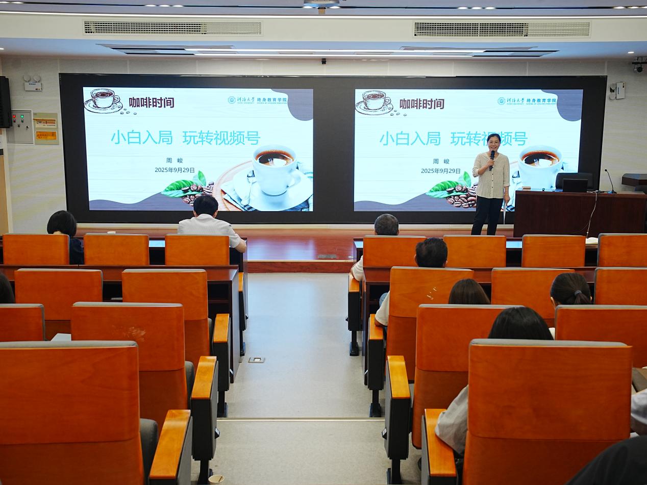 9月29日下午,永利集团304am登录附楼401报告厅内,咖啡醇香与欢乐氛围交织,由学院分工会精心组织的本年度第五期“咖啡时间”活动在此举行。本次活动以“小白入局—玩转视频号”为主题,邀请学院企业教育培训中心主任周峻担任分享嘉宾,全院教职工积极参与。